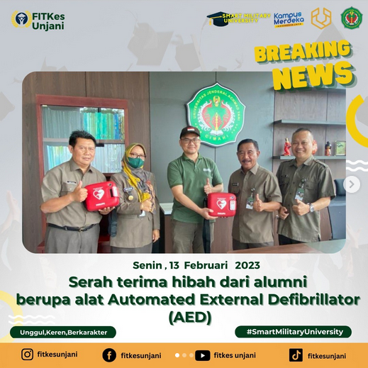 Senin, 13 Februari 2023 telah dilaksanakan serah terima hibah dari alumni berupa alat AED Philips FRX yang diberikan oleh bapak Arif Susanto yang merupakan lulusan Prodi Kesehatan Masyarakat (S-I) yang bekerja di PT Freeport Indonesia (PTFI), acara tersebut dihadiri oleh Dekan Fitkes Unjani (Gunawan Irianto, dr., M.Kes), Wakil Dekan I (Dr. Budiman, S.KM., M.H.Kes, M.Kes), Wakil Dekan II (Dr. Novie E. Mauliku , SKM., M.Sc), Kaprodi Kesehatan Masyarakat S-I (Asep Dian A., S.KM., S.Pd., MM., M.H.Kes) dan Sekproodi Kesehatan Masyarakat S-I (Ruhyandi, S.KM., S.Pd., M.KM). AED (Automated External Defibrillator) merupakan sebuah alat medis yang dapat menganalisis irama jantung secara otomatis dan memberikan kejutan listrik untuk mengembalikan irama jantung jika dibutuhkan. Alat ini berfungsi untuk menolong orang yang mengalami henti jantung. . Dalam sambutannya Dekan Fitkes Unjani Gunawan Irianto, dr., M.Kes mengucapkan terima kasih atas hibah yang diberikan oleh alumni terhadap kampus dan semoga ini bisa menjadi inspirasi bagi alumni yang lain. Selain itu Dekan Fitkes juga berharap semakin banyak terbentuknya ikatan alumni diberbagai wilayah yang ada di indonesia guna memudahkan koordinasi dan membesarkan nama baik Unjani.